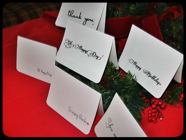 Then I started thinking of other friends, neighbors, and co-workers I could give a gift of note cards to. I decided to design some of my own, with their own simple message, using the black print and the touch of red.