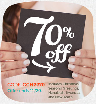 Good news!  Cardstore has extended their 70% off + FREE shipping on all holiday cards through 11/20  when you use coupon code CCN2270 at checkout.