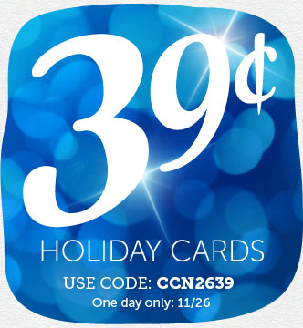 Today only (11/26) get $0.39 Holiday Cards + FREE shipping when you use coupon code CCN2639 at checkout. That means if you select ‘Ship to Recipient’ at checkout, you’ll be paying less than the cost of a stamp! I don’t know how you’ll find a better deal than that.