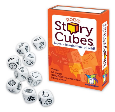 “Rory’s Story Cubes is a pocket-sized creative story generator, providing hours of imaginative play for all ages. With Rory’s Story Cubes, anyone can become a great storyteller and there are no wrong answers. Simply roll the cubes and let the pictures spark your imagination! There are infinite ways to play with Rory’s Story Cubes. You can play solitaire or with others. Here are some suggested uses: Party game or ice-breaker, Literacy development, Speaking and listening skills, Creative inspiration, Mental workout, Problem solving.”