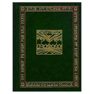 This deluxe collector’s edition of Tolkien’s modern classic is boxed and bound in green leatherette with gold and red foil rune stamping on the spine and cover. The text pages are printed in black with green accents. It includes five full page illustrations in full color and many more in two color in addition to Thror’s map — all prepared by the author.