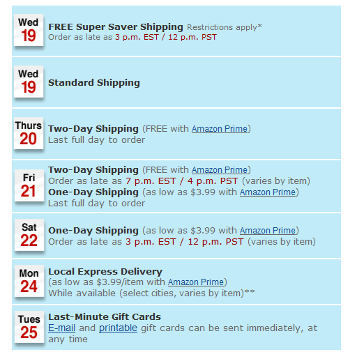 I just wanted to give you a heads up about Amazon’s Christmas Delivery cut off dates. You can head over here to find out when the last day is to order in time for Christmas delivery based on which method of shipping you choose at checkout.