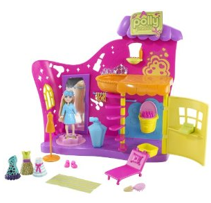 “Polly Pocket Color Change Makeover Salon Playset: This is the ultimate salon, where girls can give Polly doll a head-to-toe makeover and stylish new look. To start, Polly can pick out a nail color and get a pedicure. Dip her toes in cold water, and the nail color will really change. Next, she can head upstairs to get her hair done-cold water gives her hair pink streaks. When Polly doll’s hair is done, she can head back to the first floor to select an outfit. Spritz the fashion with cold water to reveal a fun pattern and the perfect look for a girls’ night out. Includes doll with color-change hair and toes, 4 color-change fashions, bathrobe, brush applicators, pedicure/salon chair and a squirter to activate the color change on the fashions.”