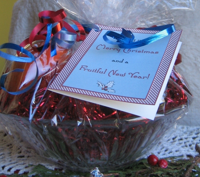 For a second mini-fruit basket, I filled a pretty little glass bowl from the Dollar Store with a strand of red tinsel garland, then added three pieces of fresh fruit–an apple, a pear, and an orange–and a few Kisses. Finally, I wrapped it all with cello wrap, tied it with some curly ribbon, and attached the same Fruit Basket Printable Card.
