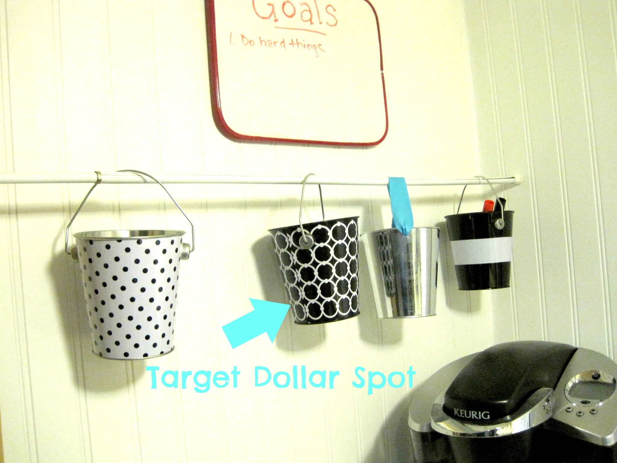 I LOVE this idea that she threw together. These little buckets are from the Target Dollar Spot and will make perfect holders for cream and sugar packets in my little coffee corner. 🙂