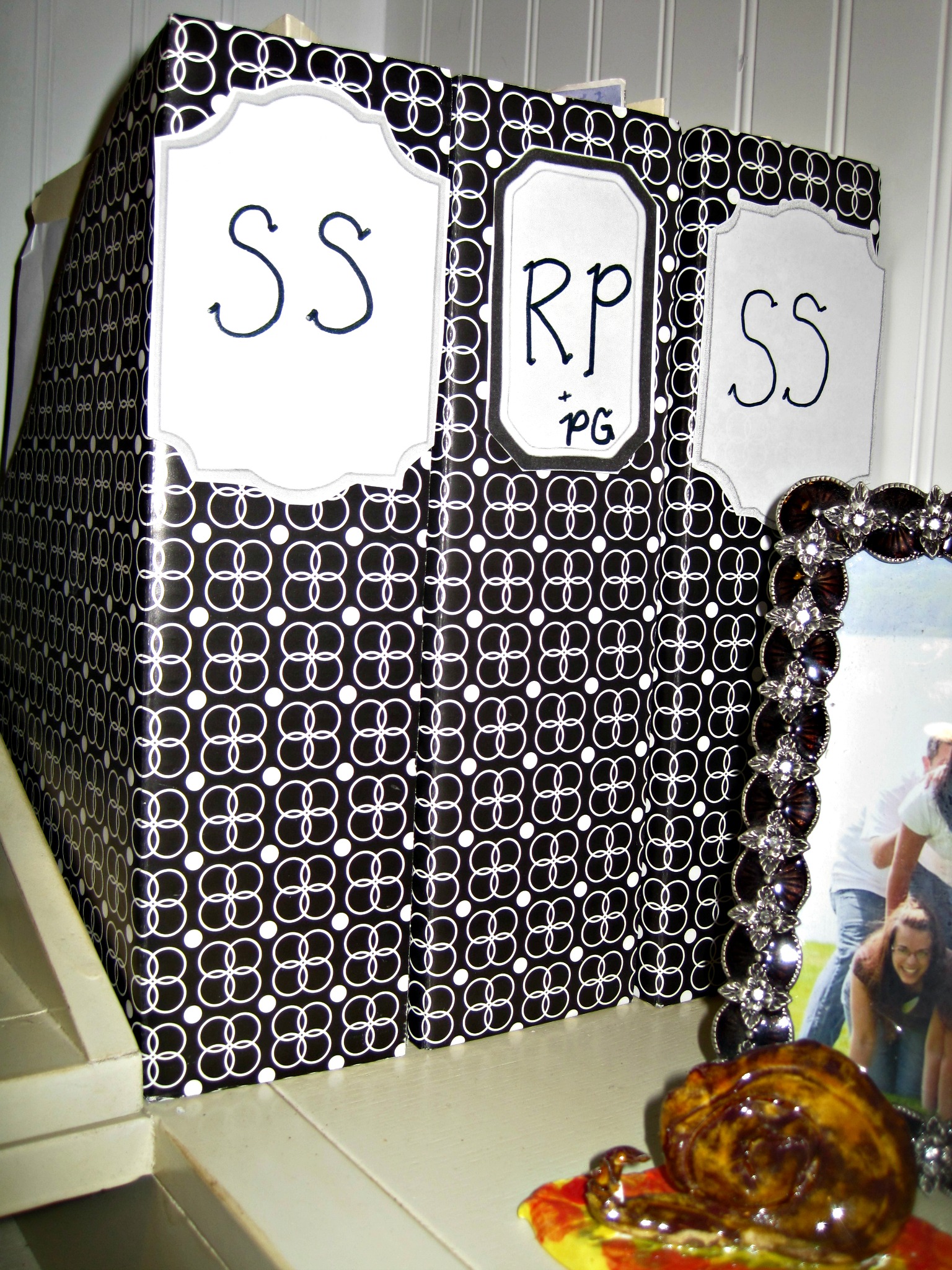 I purchased these little chalkboards on a whim last year (my Mom would be proud!), but never could figure out how to make them work. Megan knew exactly how to put them to use (plus they are hiding some ugliness on our old metal filing cabinet!).