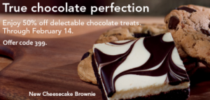 Starbucks is offering 50% off any chocolate dessert through tomorrow 2/14. Print your coupon (or show it on your mobile device) and enjoy a cheesecake brownie, chocolate chunk cookie, double chocolate brownie, or chocolate bites for half price!