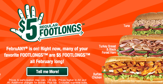 This is the biggest FOOTLONG event of the year. Several favorite varieties are just $5 all month and there are some new $6 FOOTLONG specials, too. For breakfast, lunch or dinner, this is a great way to treat the entire family to good food on the cheap!