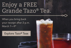 Beginning today through Saturday (3/9), get a FREE Starbucks Grande (16 fl oz) Tazo® Tea (in either hot, creamy latte, or iced flavors) when you bring back your morning receipt after 2 pm.