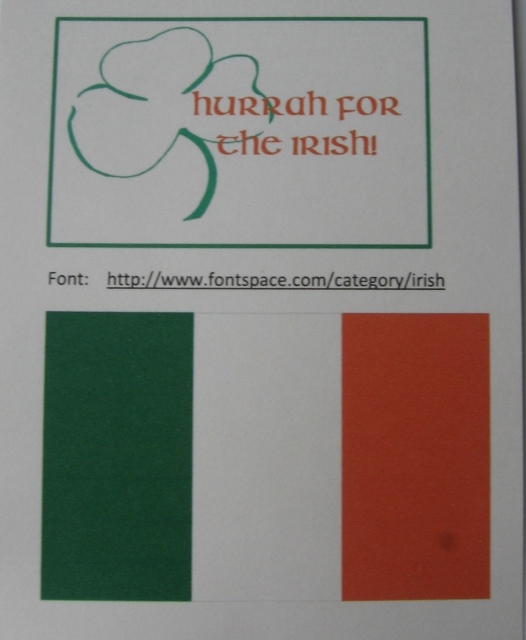 Cut out the Irish flag and the HURRAH FOR THE IRISH tag; adhere that tag to the flag cutout. Add any other colorful and creative touches you choose.