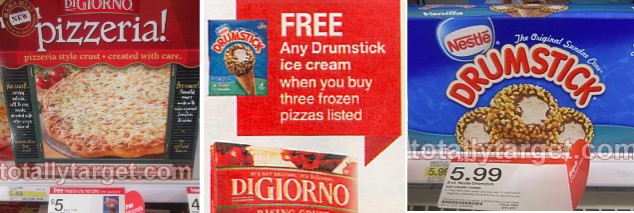 PLUS Target has a deal going on through 4/27 for a FREE Nestle Drumstick 4-8 count box when you buy 3 select Frozen Pizzas.