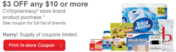 CVS is offering a coupon for $3 off any $10 CVS Store Brand items today. Limited quantities are available!