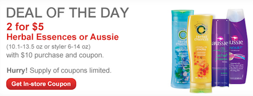 Today’s CVS Deal of the Day coupon is for $2/5 Herbal Essences or Aussie with minimum $10 purchase.