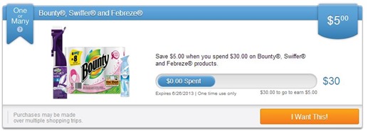 Save $5.00 when you spend $30.00 on Bounty, Swiffer and Febreze products through 6/26/2013.