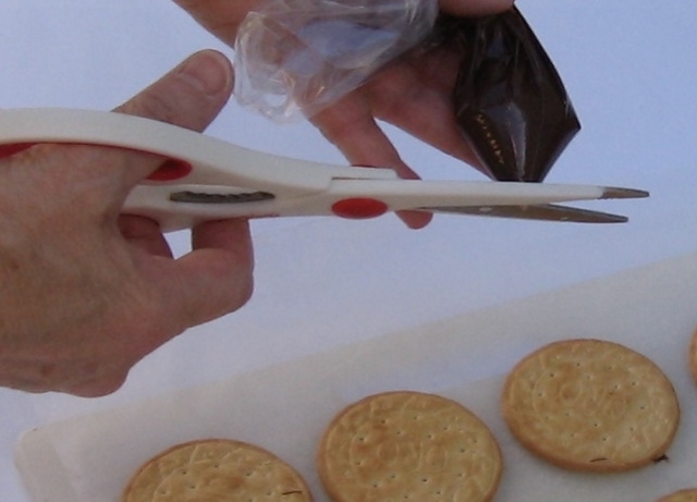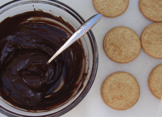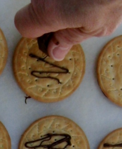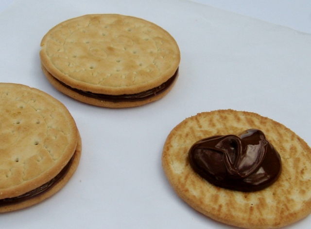 I spread a spoonful of the melted chocolate onto one of the biscuits, placed a second biscuit on top, then carefully added a little pressure to flatten the chocolate between the two biscuits